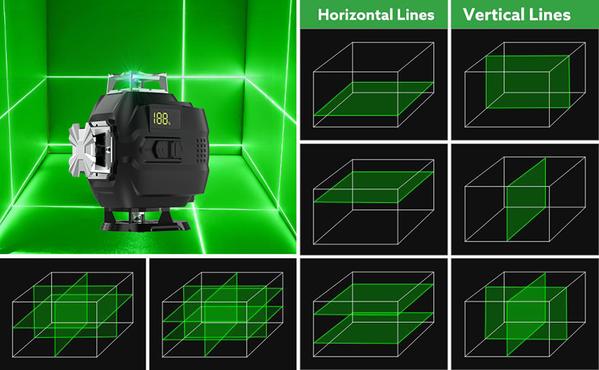 Two 360° horizontal and two 360° vertical lines provide all-around leveling coverage in floor, wall, ceiling all around the room.